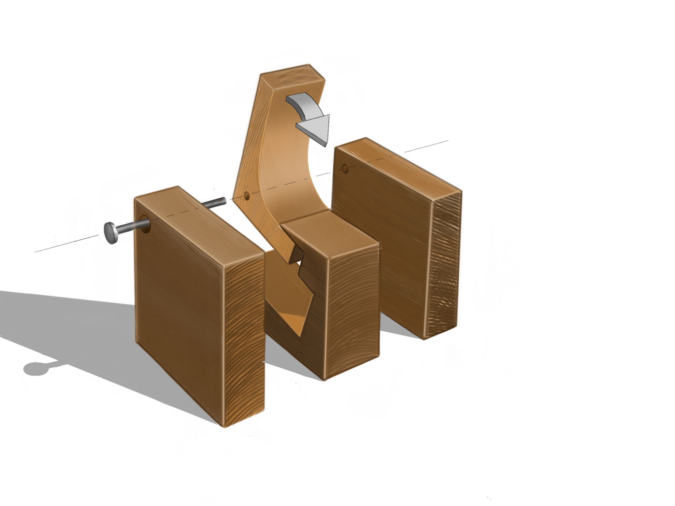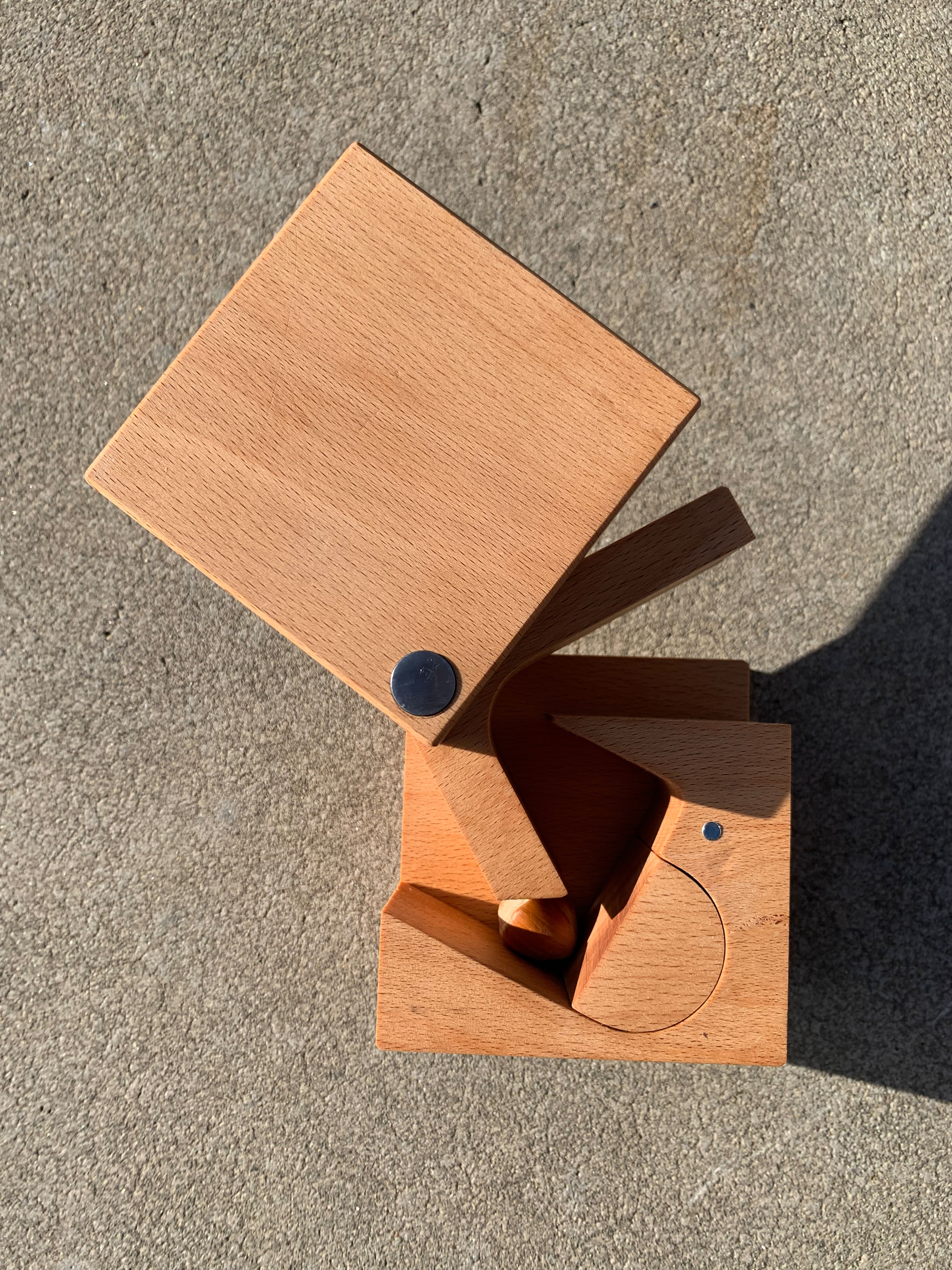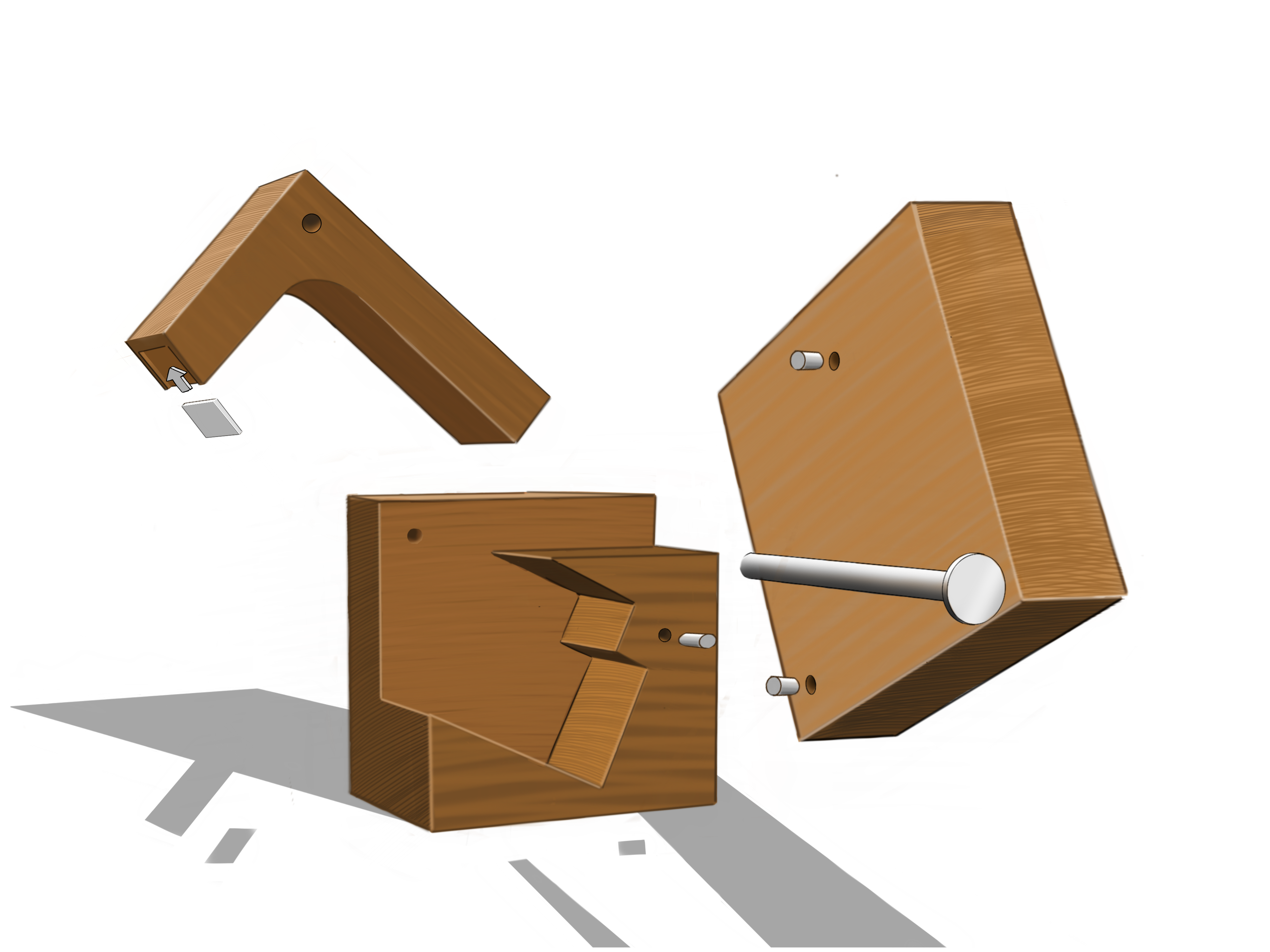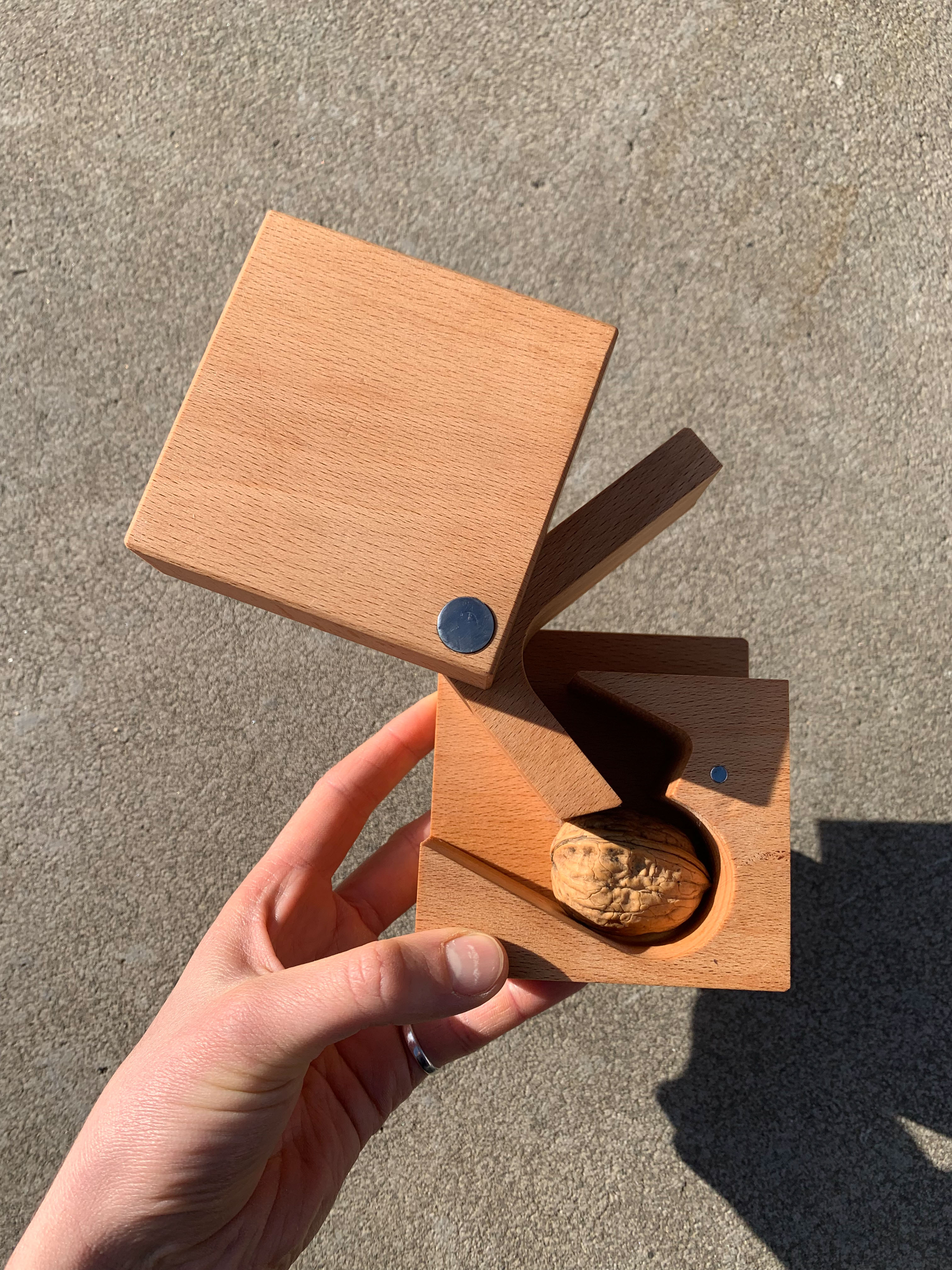 By moving the handle upwards, an opening is created at the front, allowing a nut to be inserted. Moving the handle downward cracks the nut, returning the cube to its closed shape. The front side wall can be rotated until itβs held in place by a magnet, enabling the easy removal of the cracked nut. KUBNUS measures 8.5 cm x 8.5 cm and can be easily CNC-milled. The three wooden components are fastened together with a metal pin. Additionally, three 4mm bar magnets are embedded for convenient handling, and a small metal plate is located on the bottom of the lever to protect against friction.
