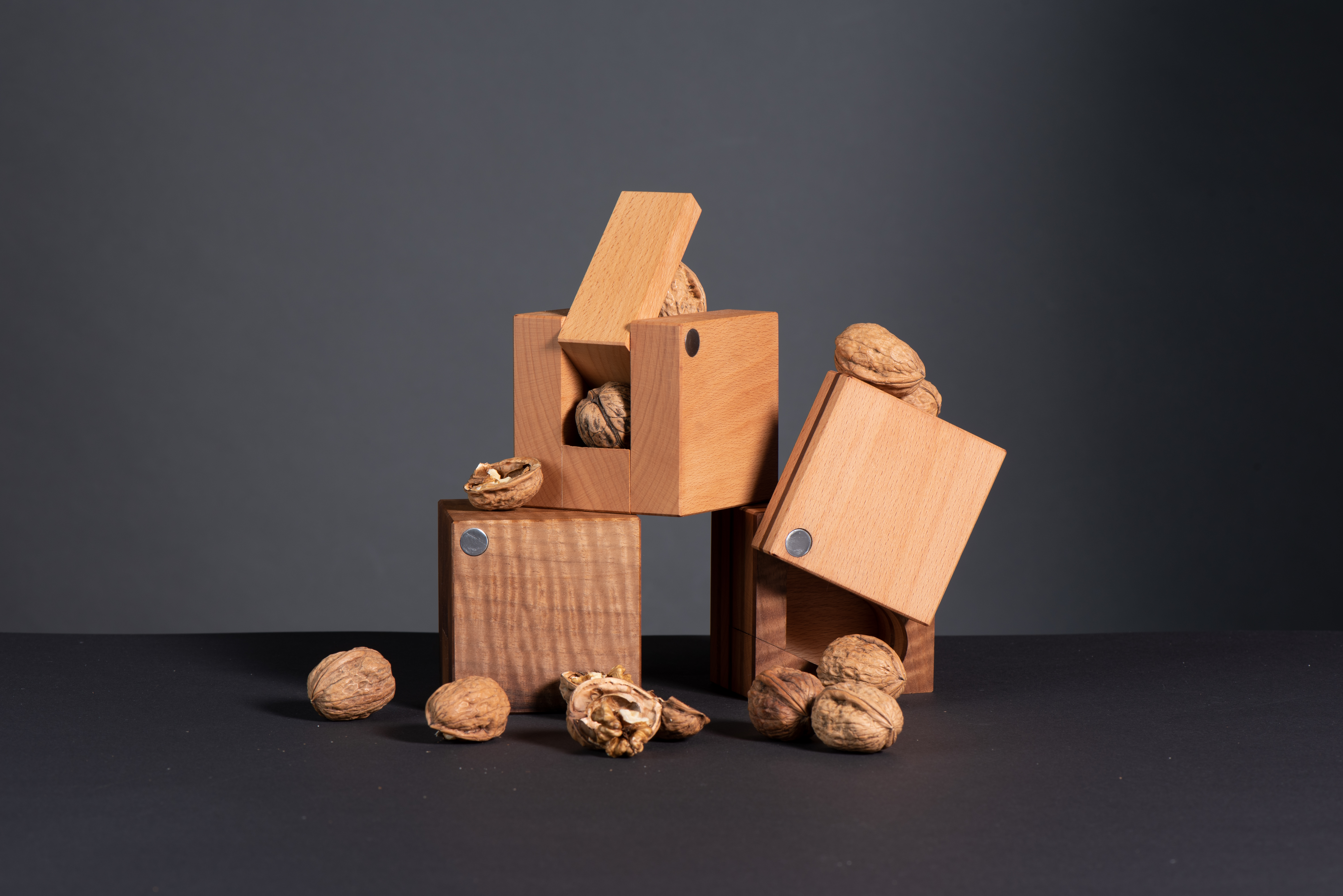 KUBNUS is a nutcracker designed for walnuts and hazelnuts. We created KUBNUS, a small, playful wooden work of art. At first glance, it appears to be just a wooden cube, but upon closer examination, it reveals itself as a nutcracker.